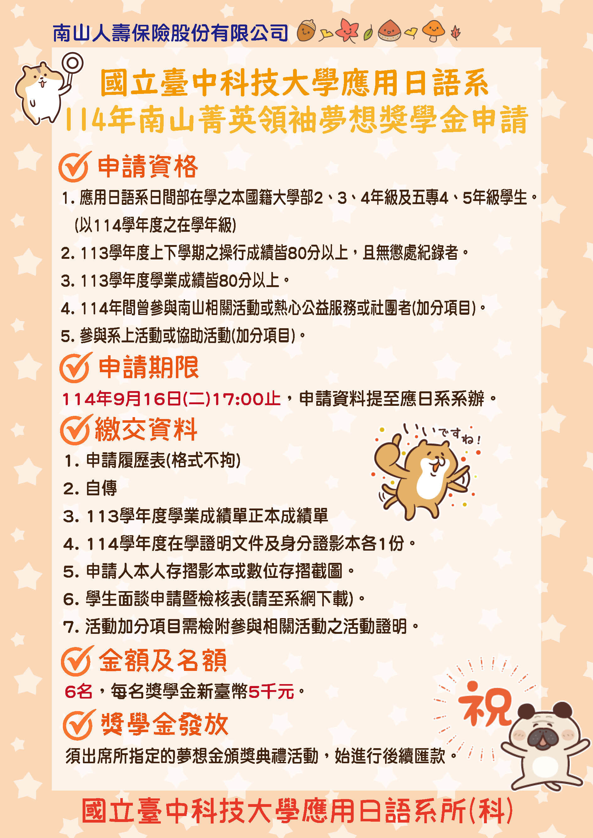114年南山菁英領袖夢想獎學金開始申請囉!