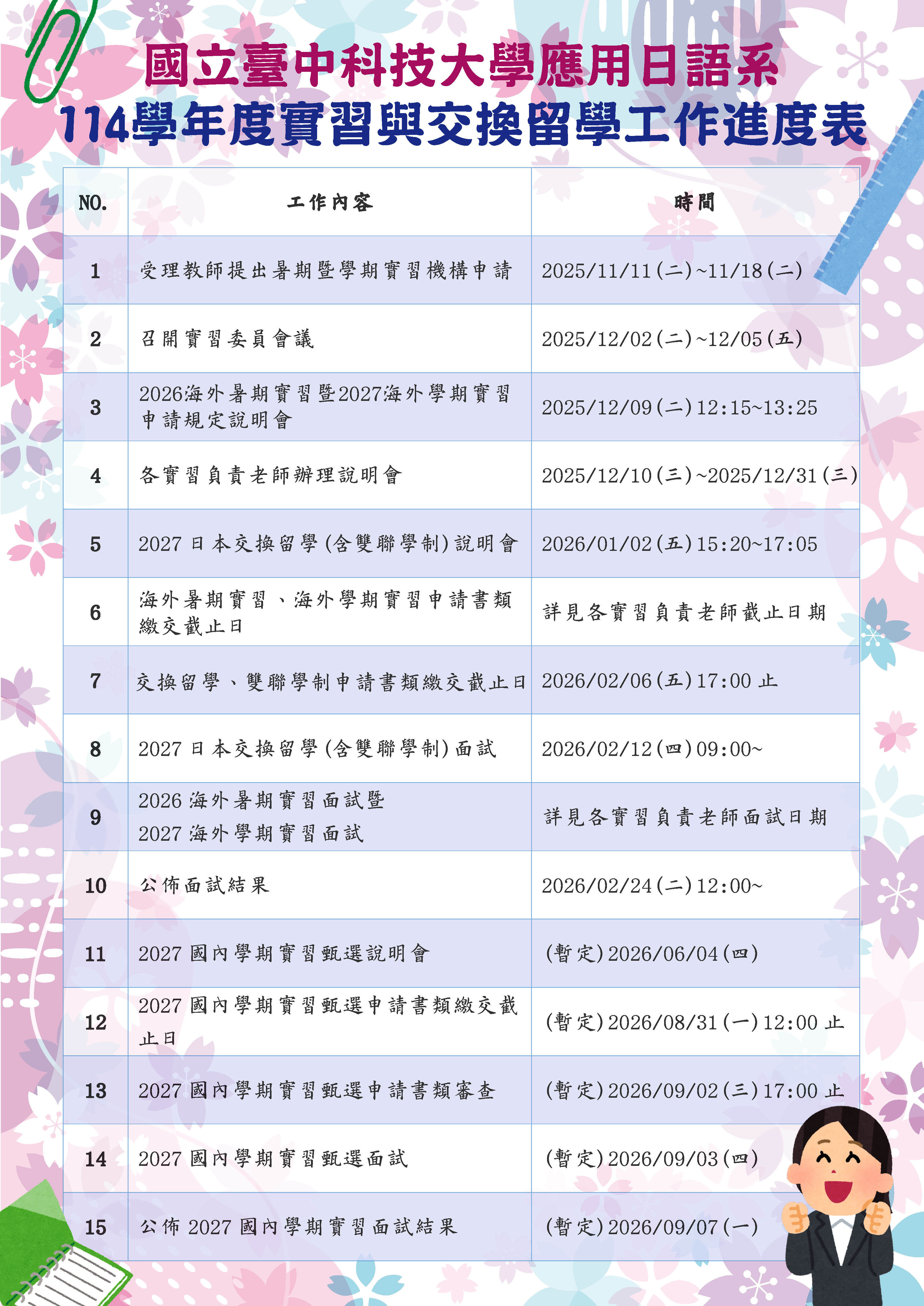 114學年度實習與交換留學工作進度表如下